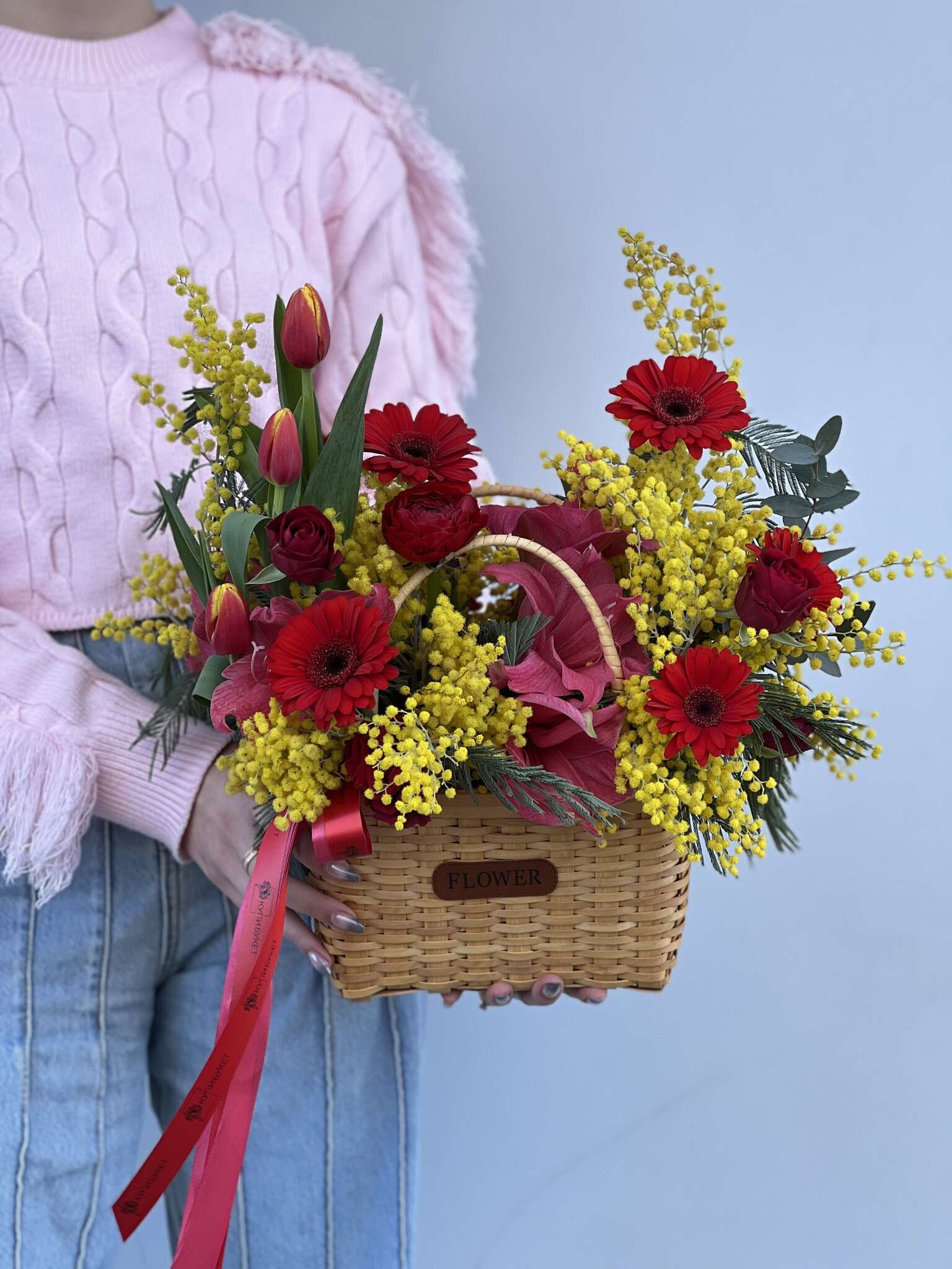 В составе букета: плетеная корзина, флористический оазис, атласная лента, гербера, амариллис, тюльпаны, кустовые розы, мимоза, розы.