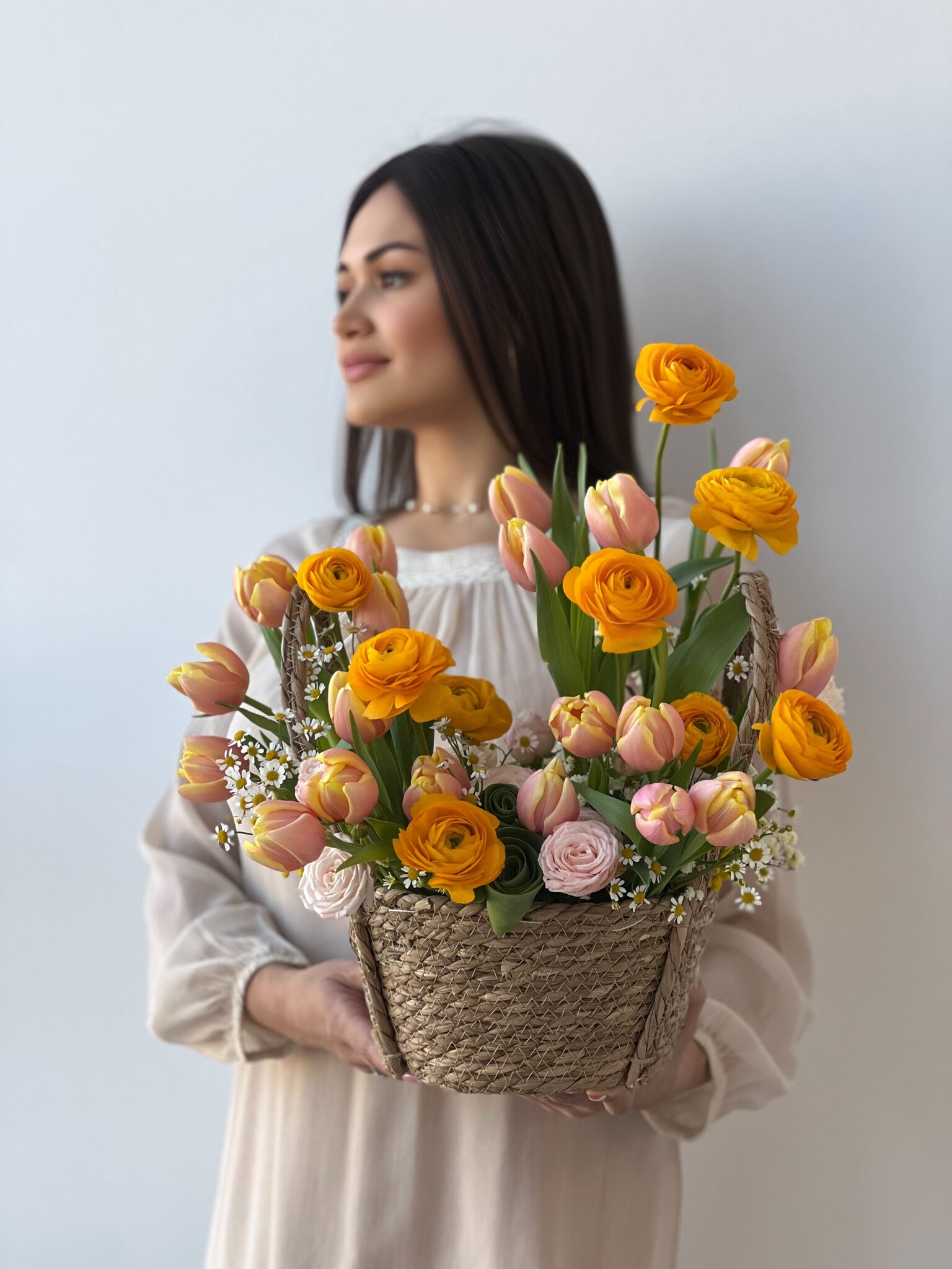 В составе букета: плетеная корзина, флористический оазис, тюльпаны, танацетум, кустовая пионовидная роза, мимоза, ранункулюсы, гипфосила.