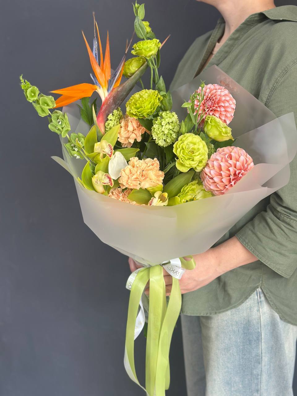 В составе букета: Стрелиция 1шт, Диантус 3шт, Эустома 2 шт, Малюцела 1шт, Георгин 2шт Цимбидиум 3 шт, Упаковка дизайнерская