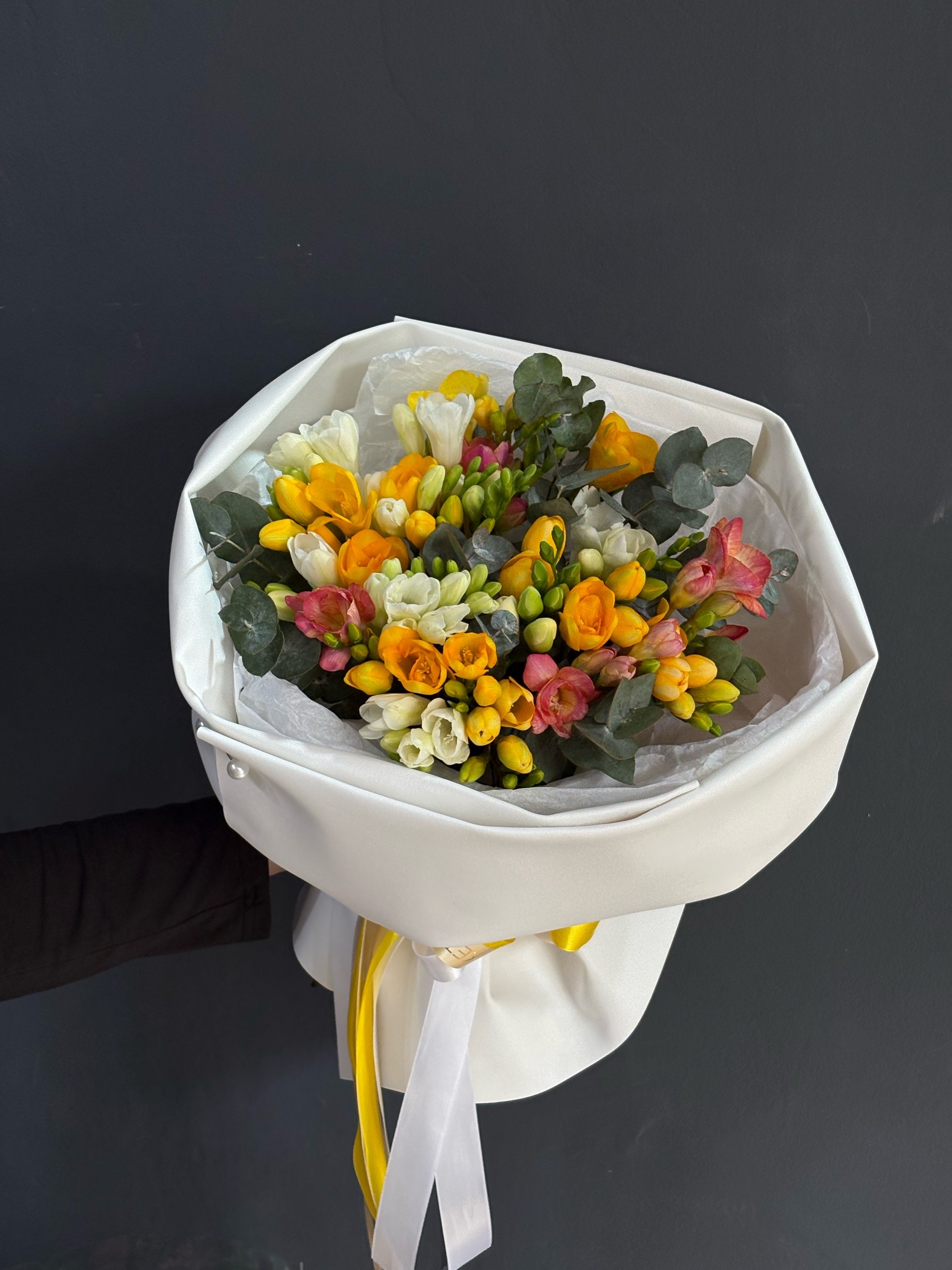 В составе букета 19 фрезий, дизайнерская упаковка