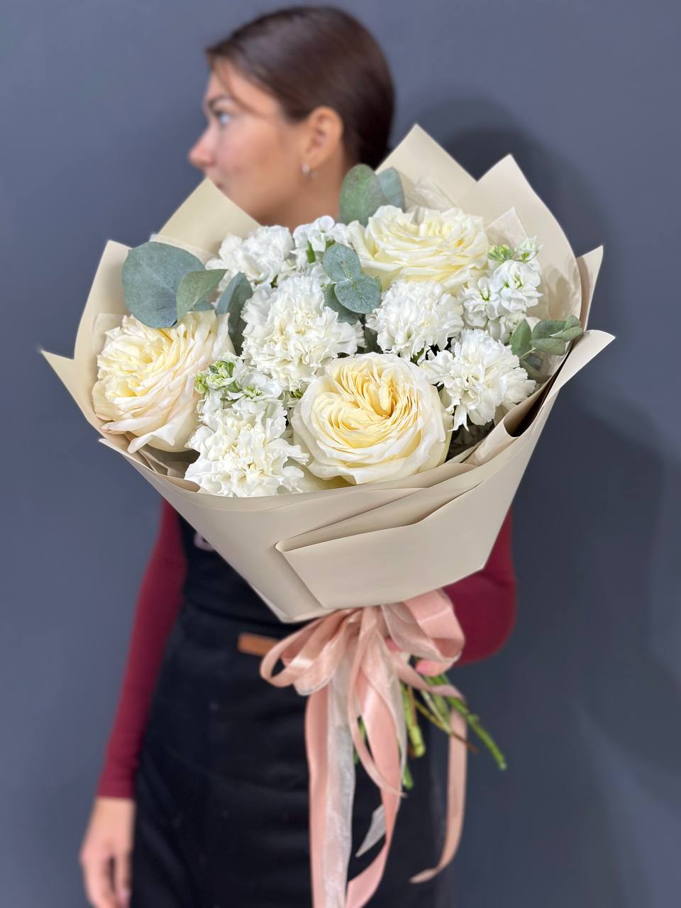 В составе букета: диантус, пионовидная роза, эвкалипт, маттиола