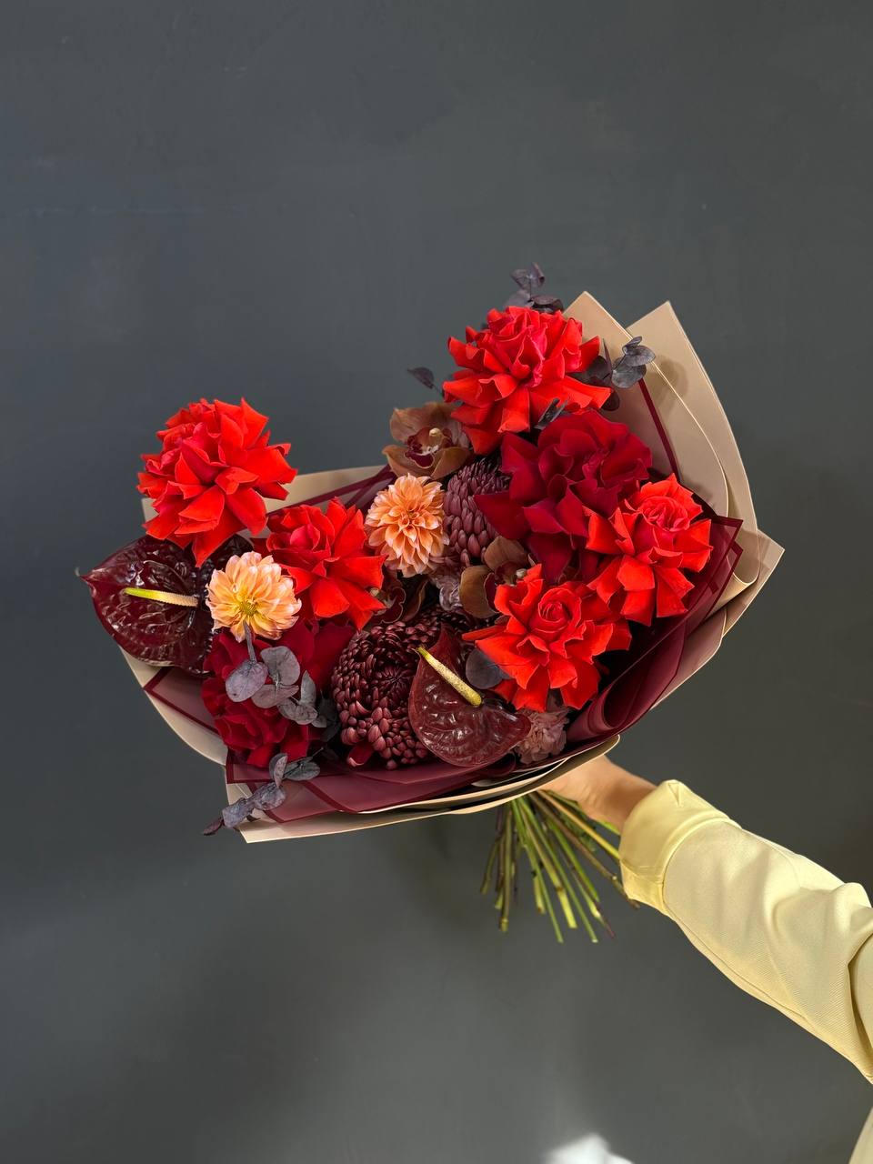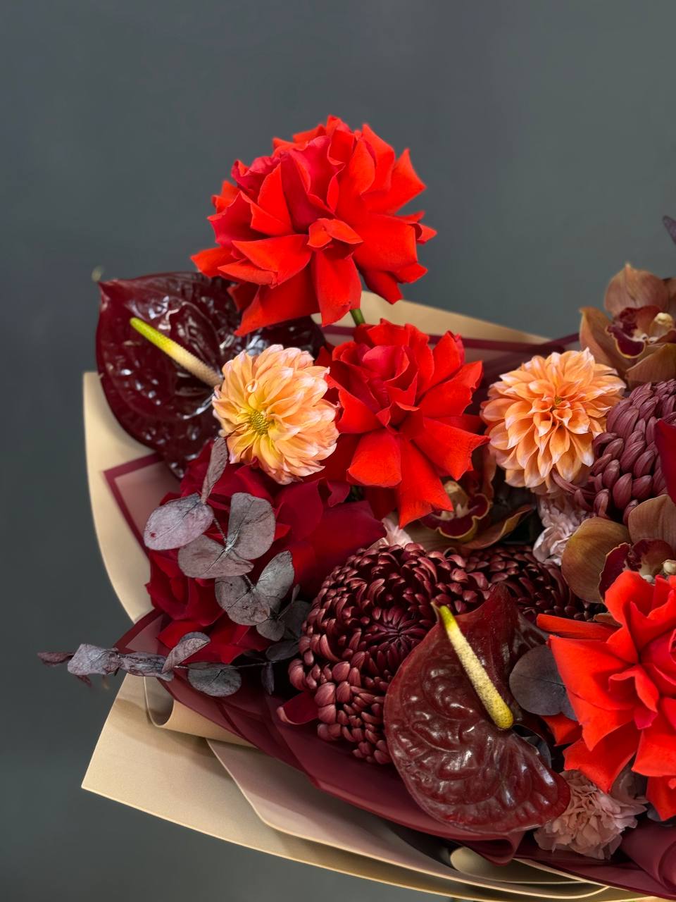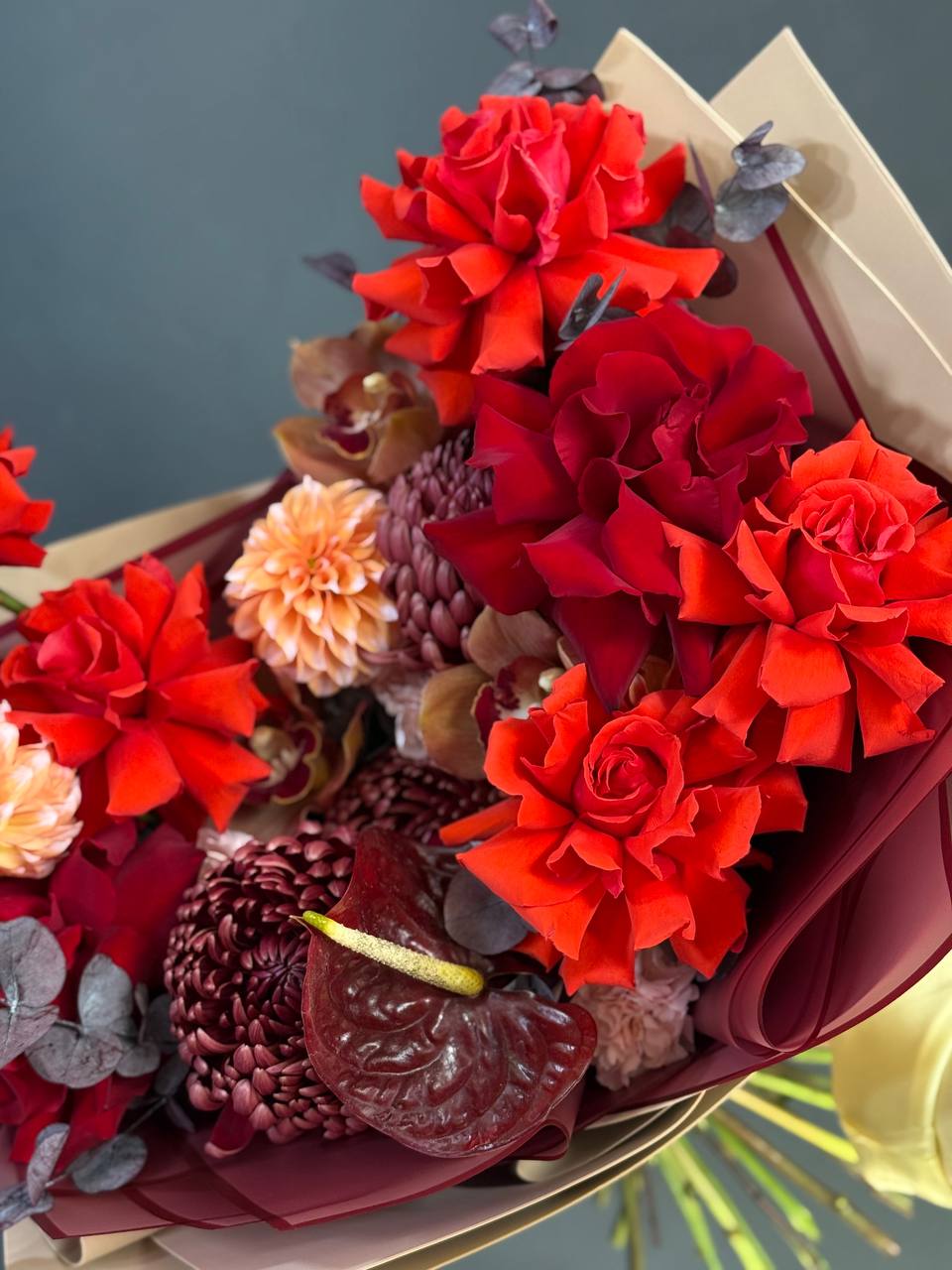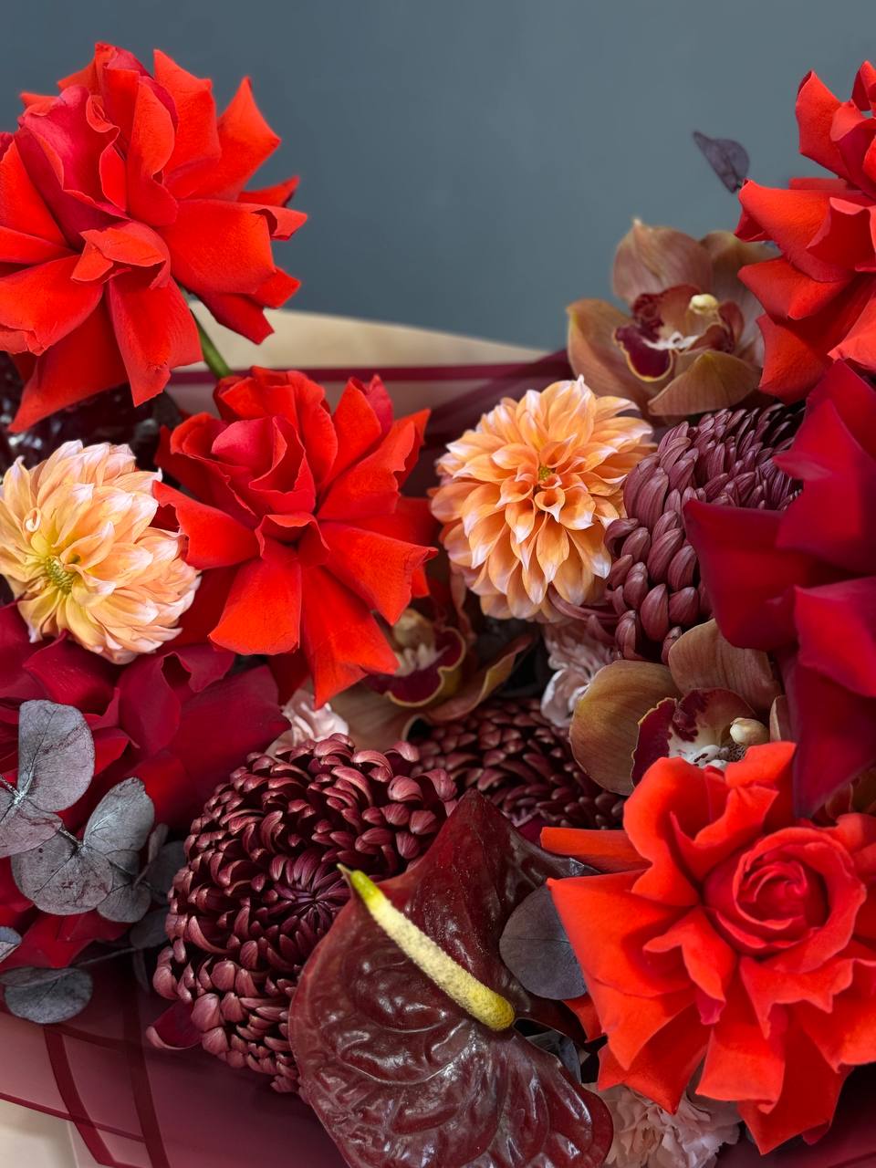 В составе букета: антуриум, роза импорт, хризантема одноголовая, цимбидиум, георгина, эвкалипт