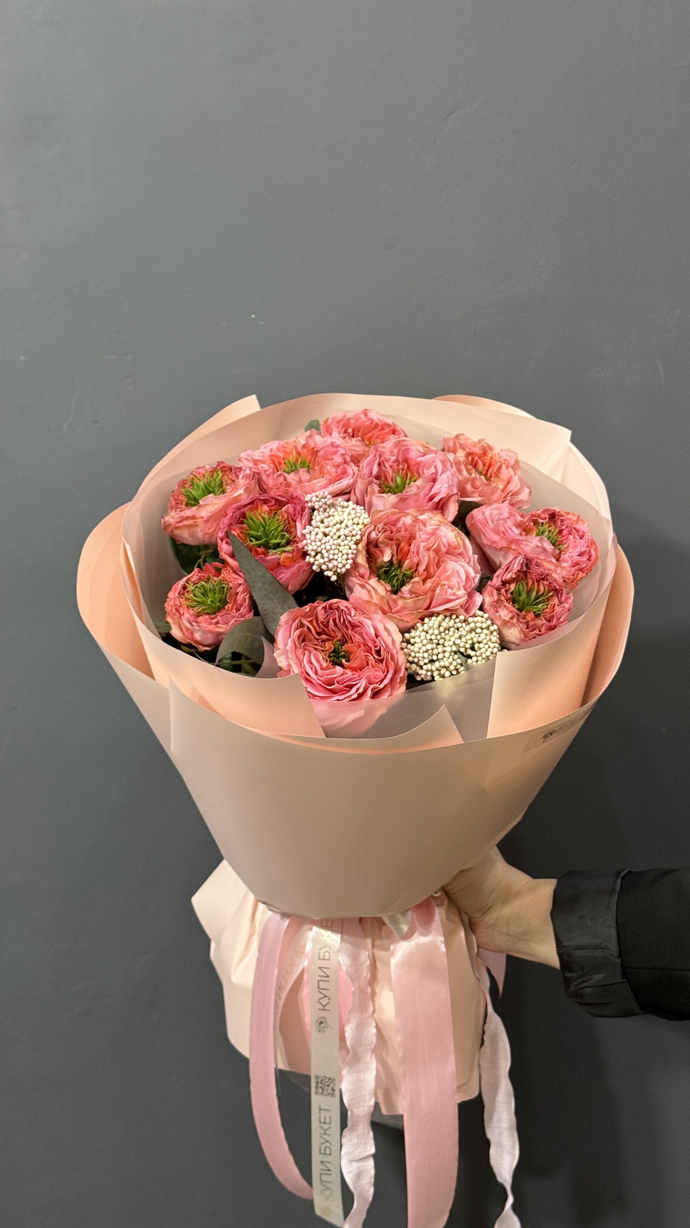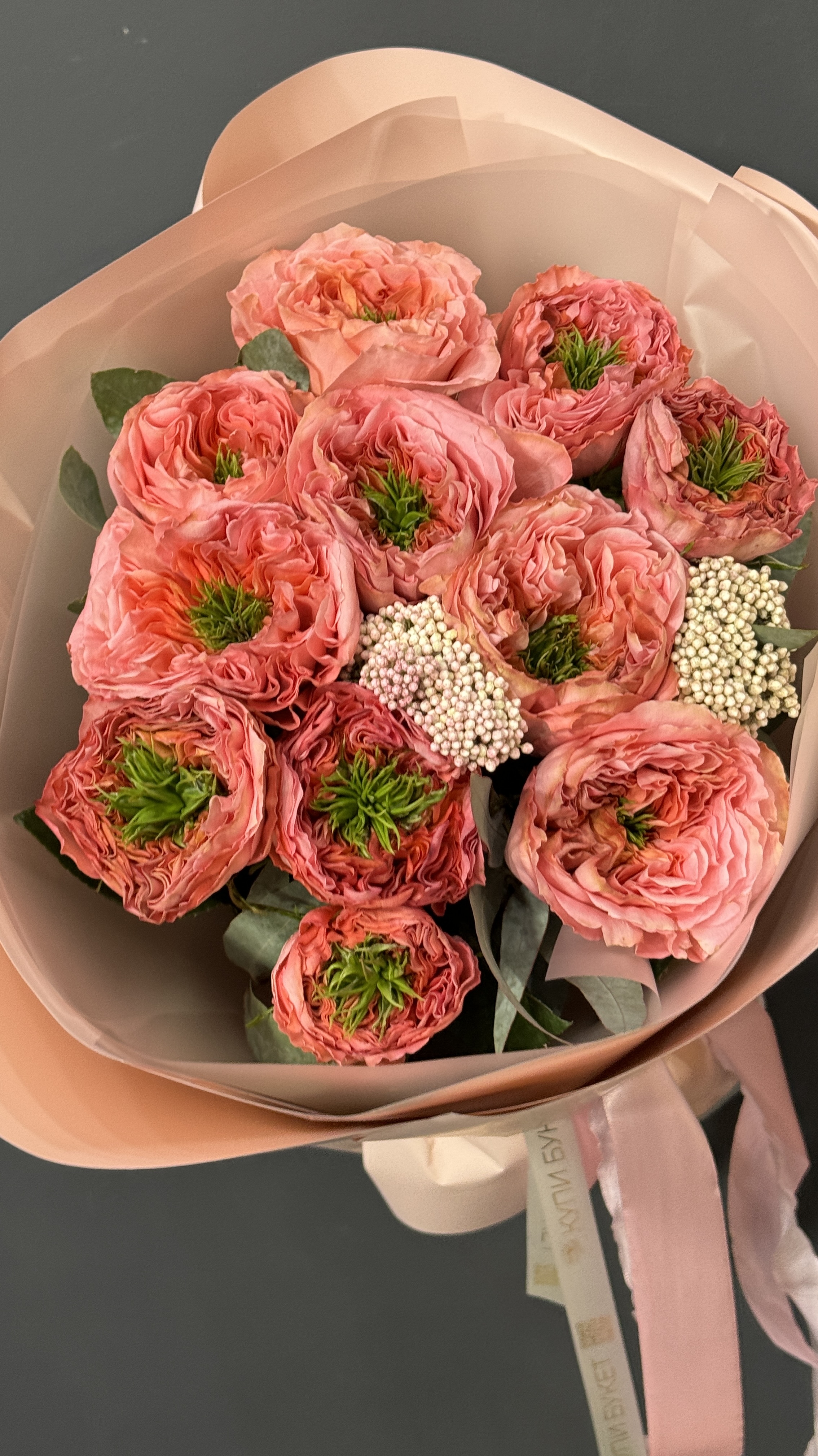 СОСТАВ: ПИОНОВИДНЫЕ КУСТОВЫЕ РОЗЫ, ДИЗАЙНЕРСКАЯ УПАКОВКА.