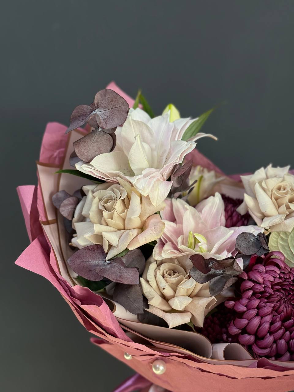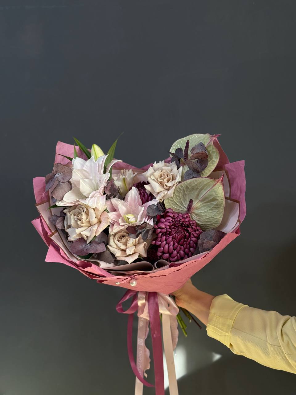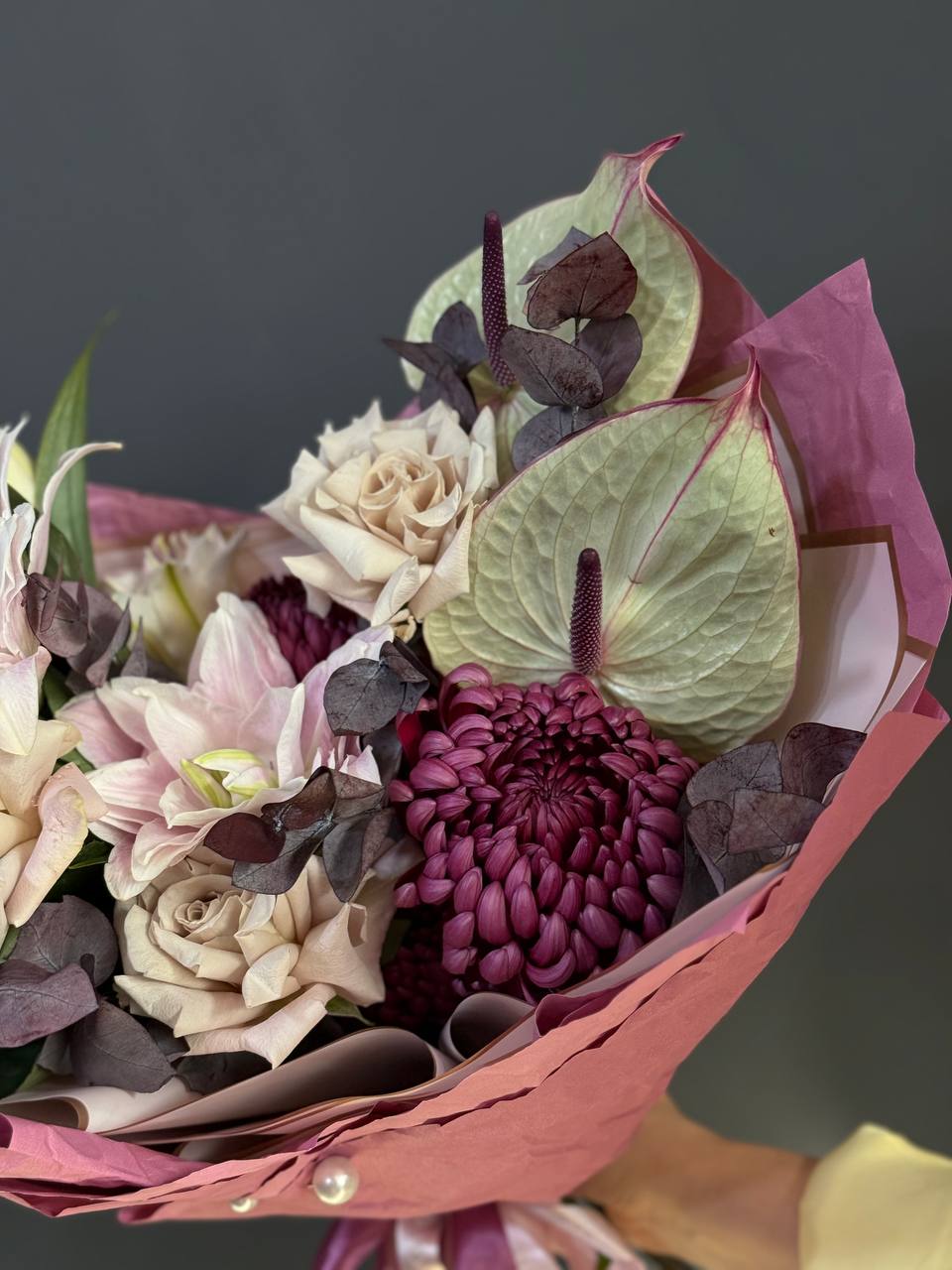 В составе букета: Роза импорт, хризантема одноголовая, антуриум, лилия, эвкалипт, упаковка