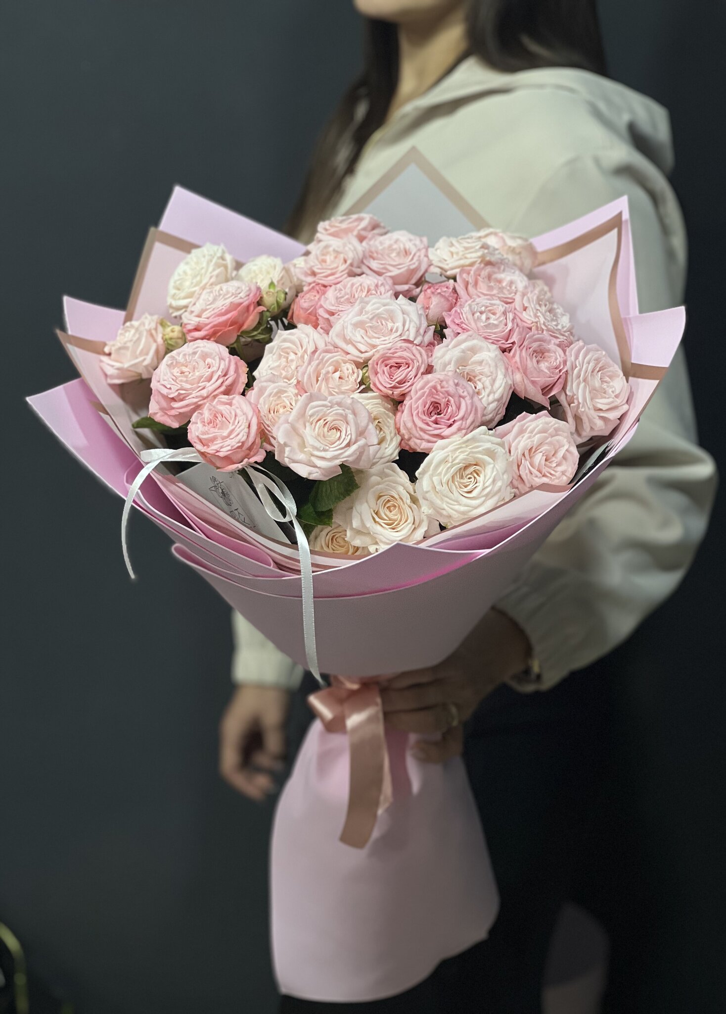 В составе букета: кустовые пионовидные розы 13 шт, дизайнерская упаковка, атласная лента.