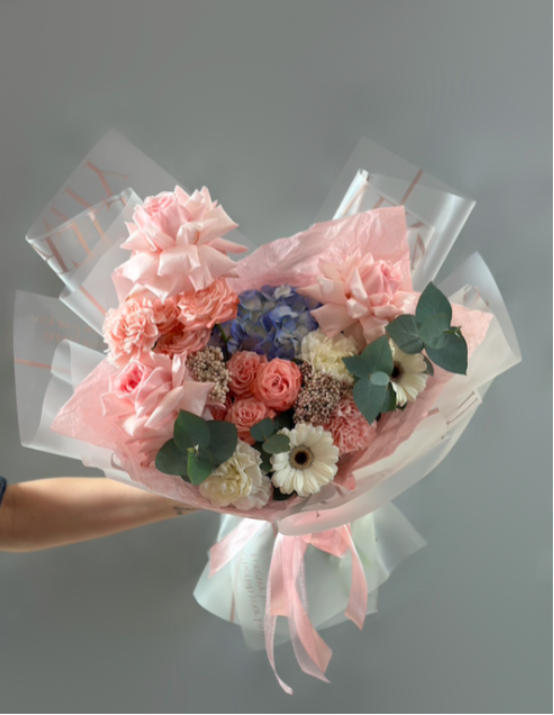 СОСТАВ: ГОРТЕНЗИЯ, ФРАНЦУЗСКИЕ РОЗЫ, ПИОНОВИДНЫЕ КУСТОВЫЕ РОЗЫ, ГЕРБЕРЫ, ДИАНТУСЫ, ДЕКОРАТИВНАЯ ЗЕЛЕНЬ, ЭВКАЛИПТ, ДИЗАЙНЕРСКАЯ УПАКОВКА.