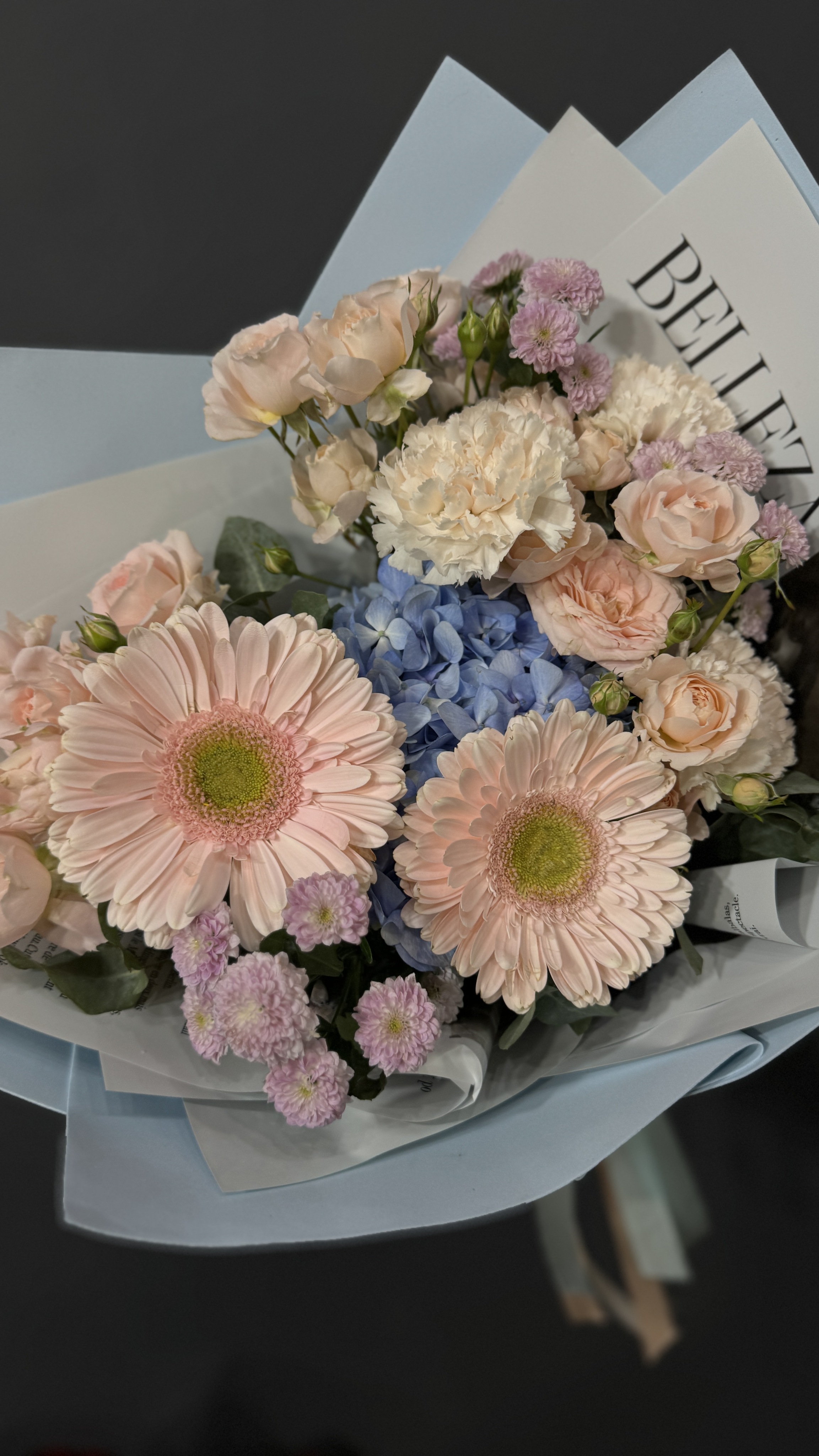 В составе букета: Гортензия 1 Эустома 5 Гербера 3 Эвкалипт...