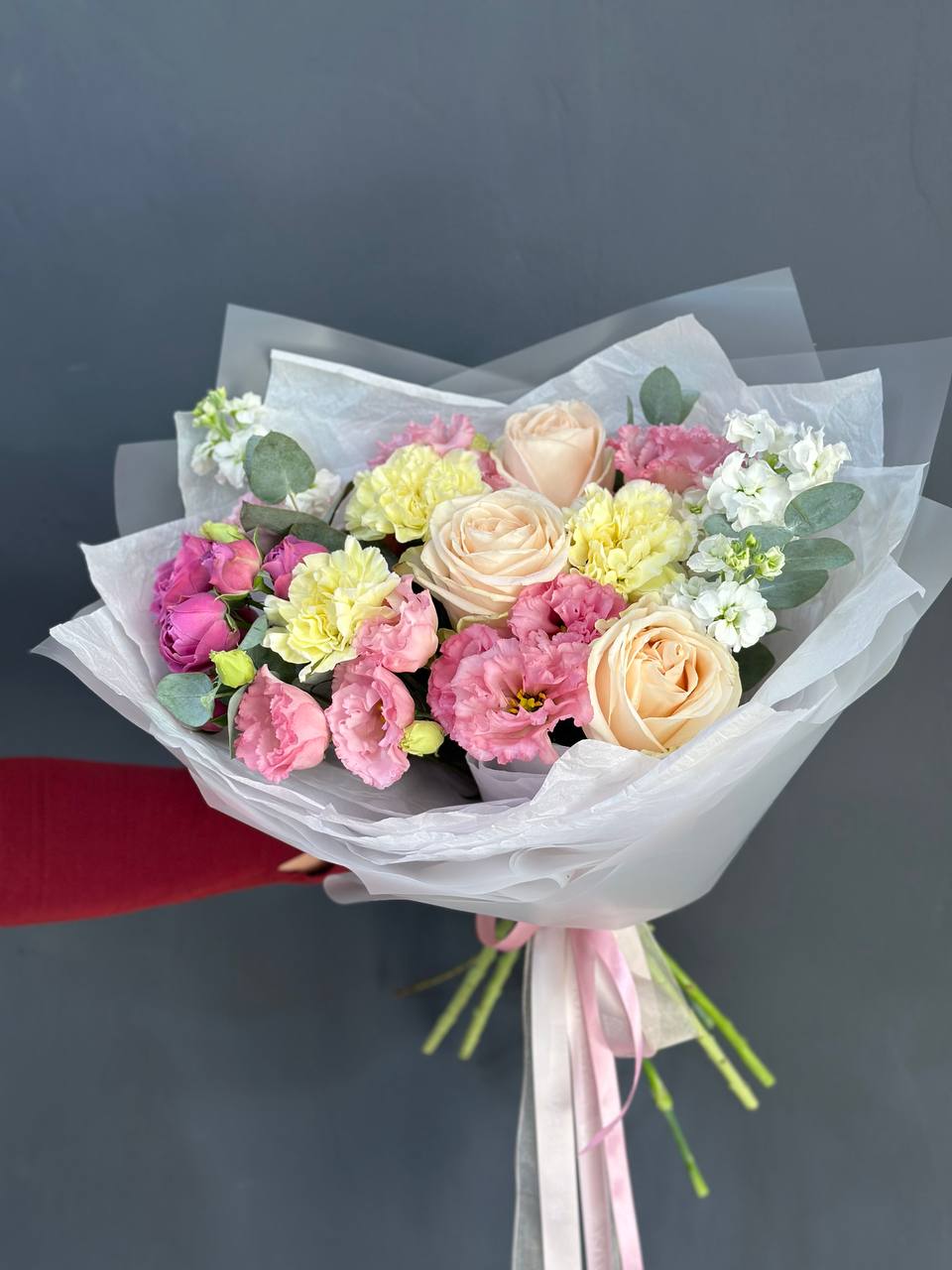 В составе букета: эустома, диантус, роза, маттиола, эвкалипт, пионовидная кустовая роза