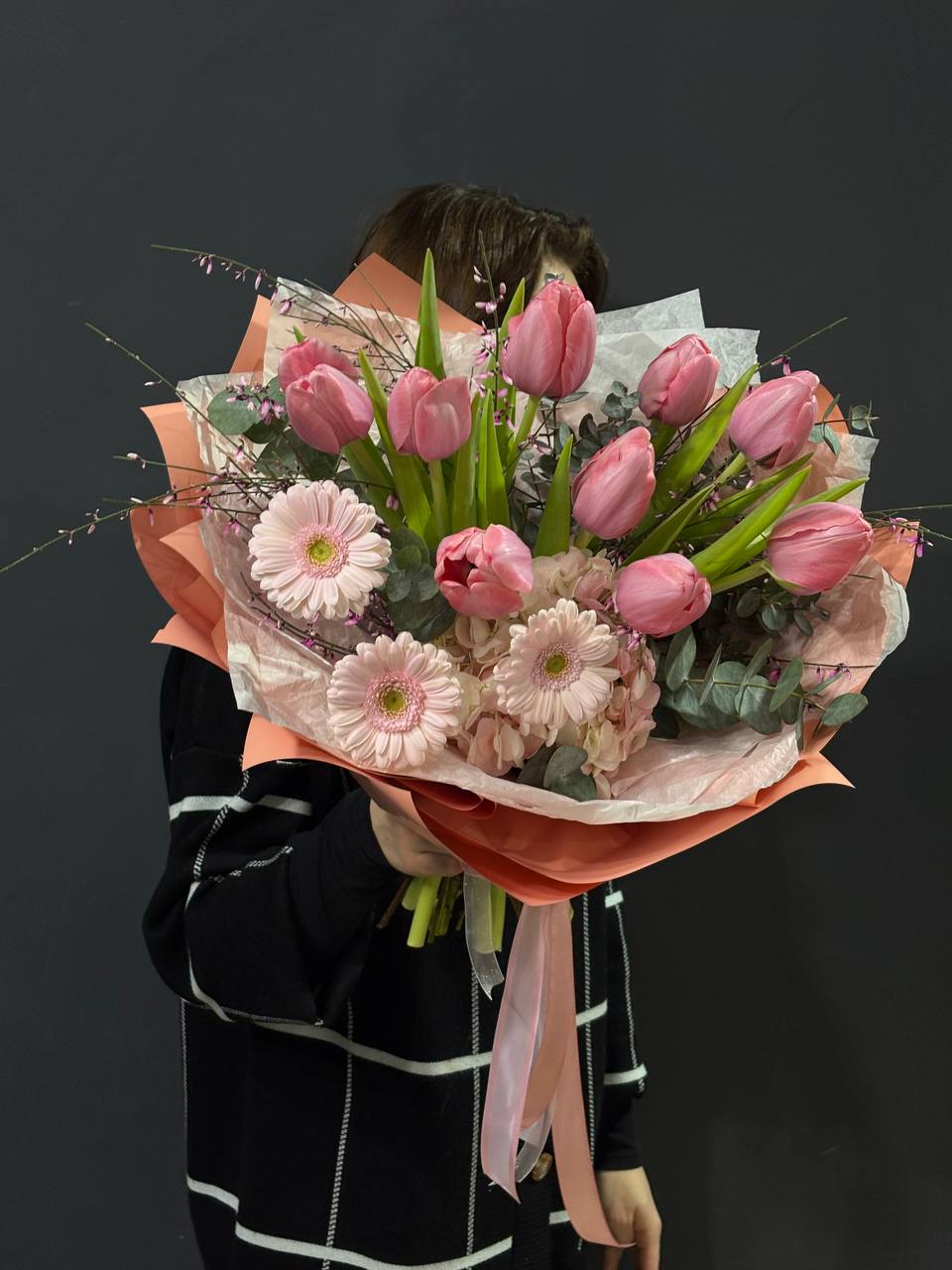 Этот букет — настоящее воплощение весны! Мы собрали для вас самые свежие и яркие цветы, чтобы ваш подарок запомнился надолго. Нежные тюльпаны символизируют пробуждение природы, роскошные розы дарят любовь и восхищение, а свежие ветви эвкалипта добавляют букету изысканный аромат и объём.