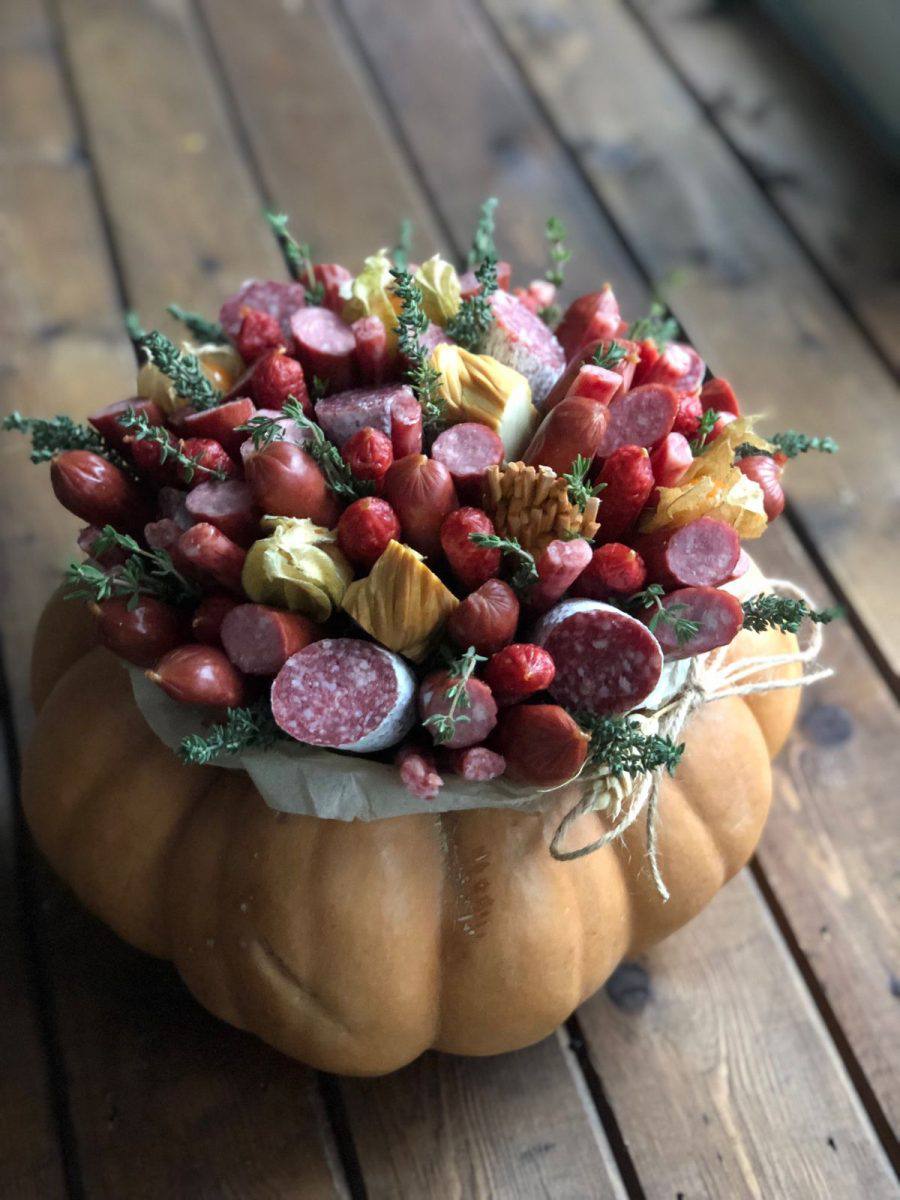 В составе подарка: тыква, колбаса копченая, колбаски охотничьи, сыр сулугуни, сыр косичка, пряные травы, сосиски.