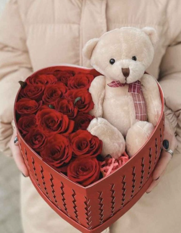 СОСТАВ: 15 РОЗ, ШЛЯПНАЯ КОРОБОЧКА, МИШКА