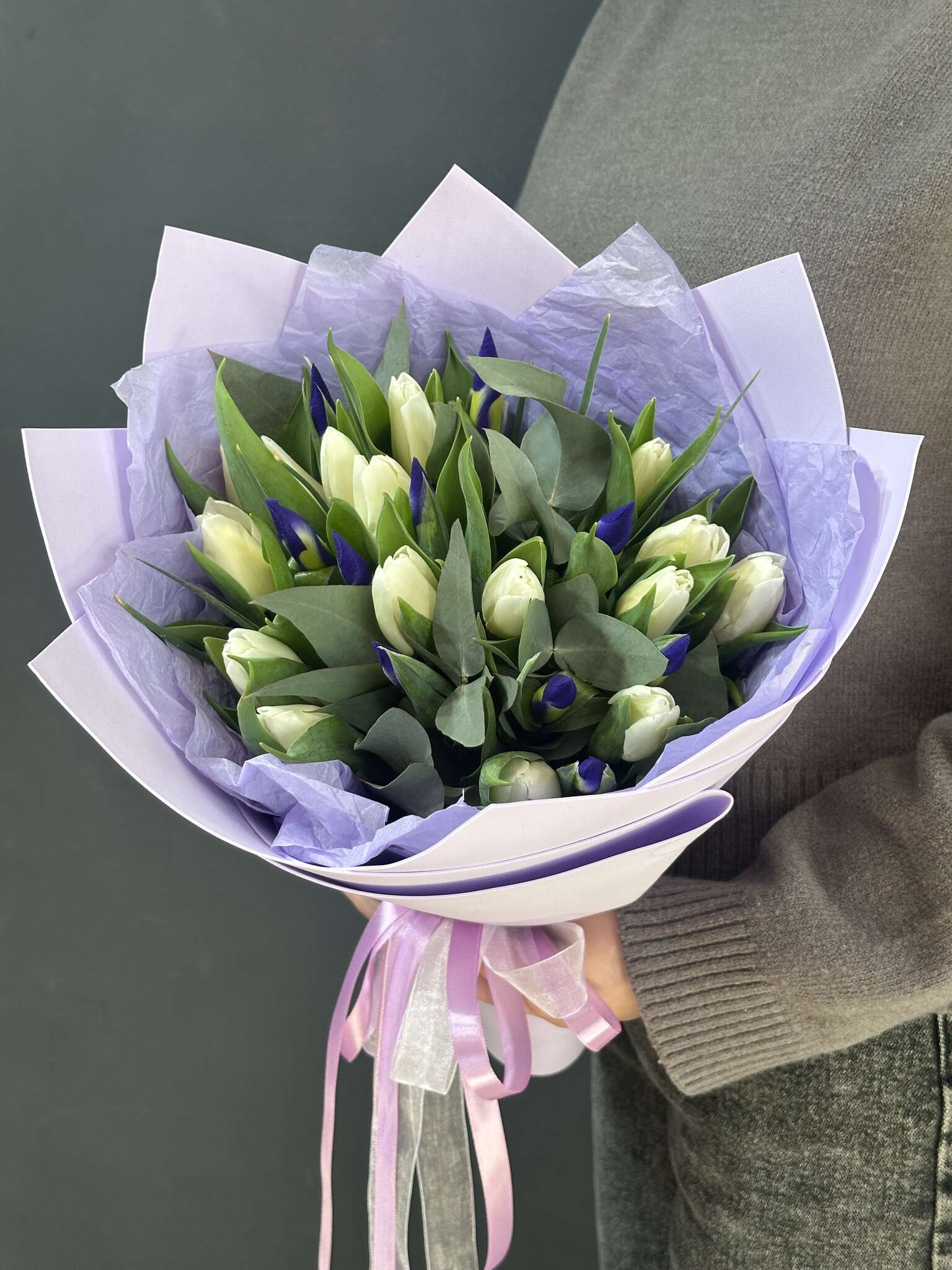 Букет из белых тюльпанов с ирисами в дизайнерской упаковке.
