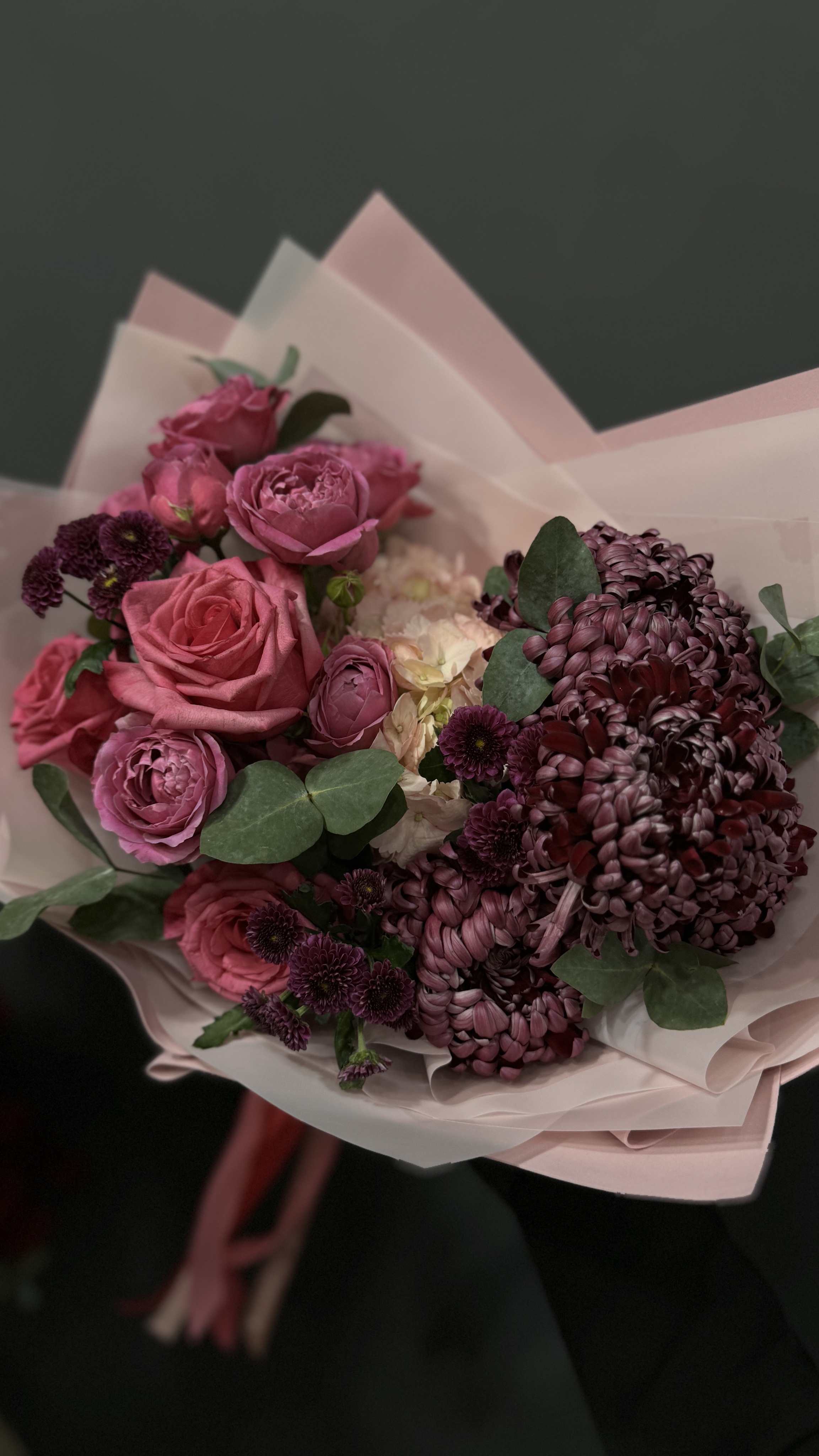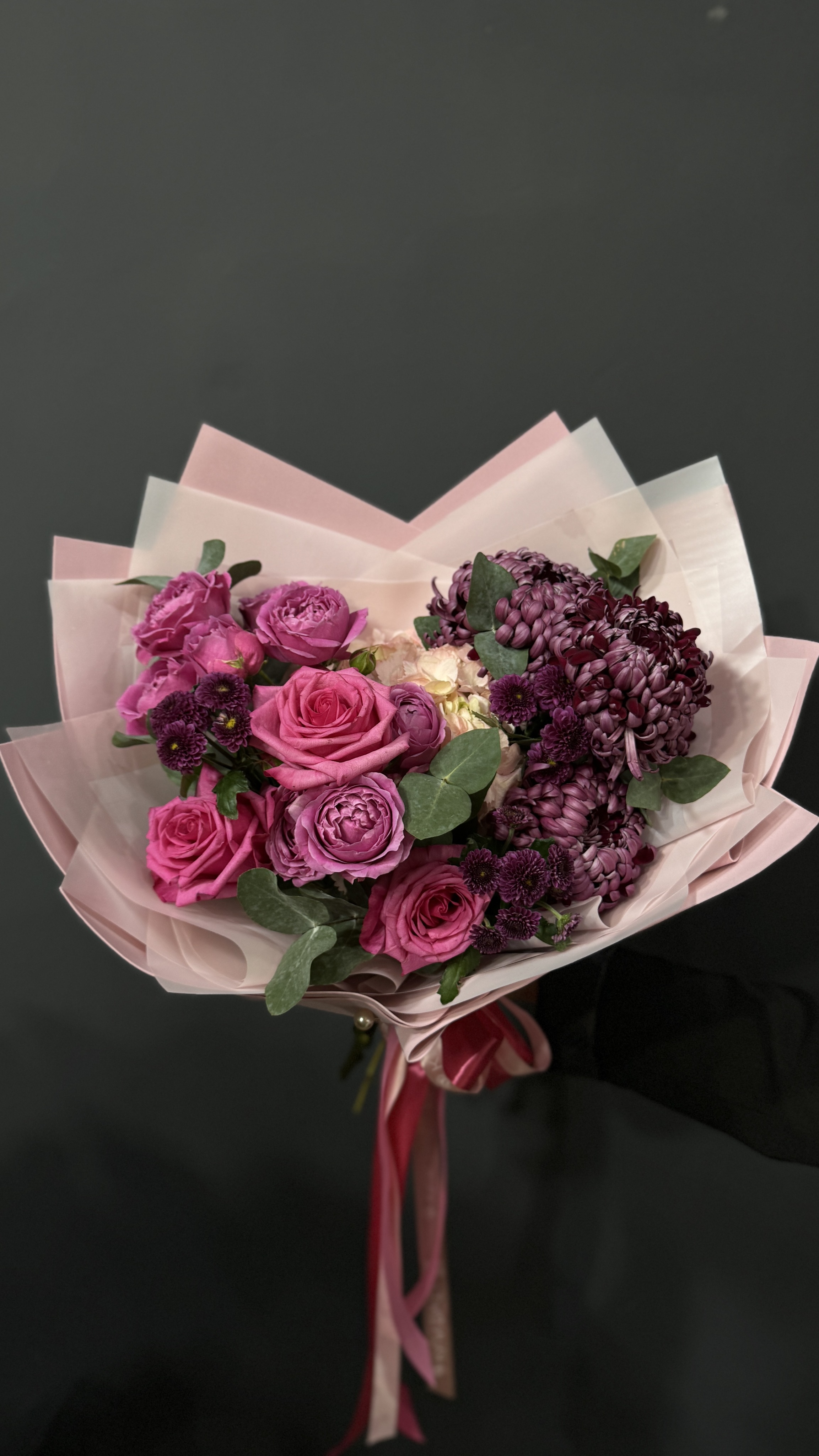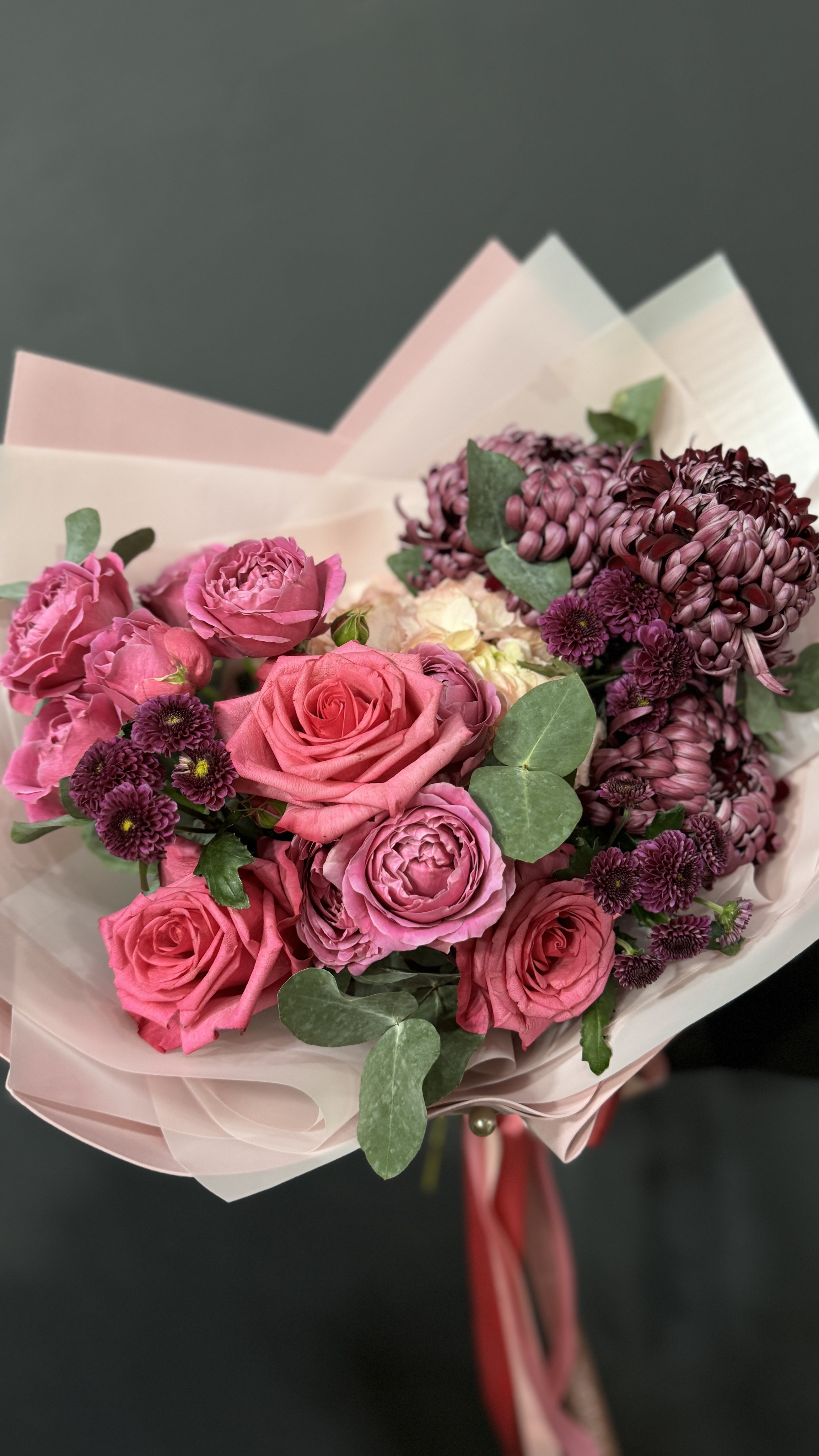 СОСТАВ: КУСТОВАЯ ХРИЗАНТЕМА, ДИАНТУС, РОЗА, ЭУСТОМА, ДИЗАЙНЕРСКАЯ УПАКОВКА, ЛЕНТА.