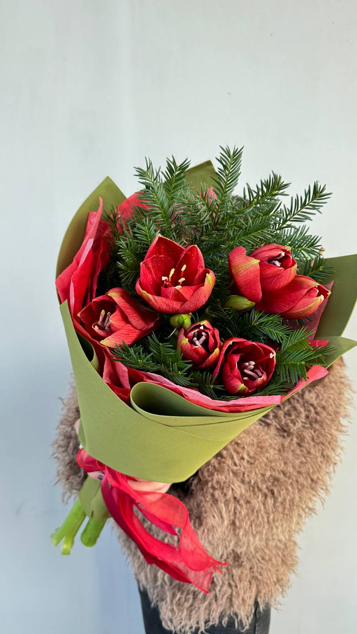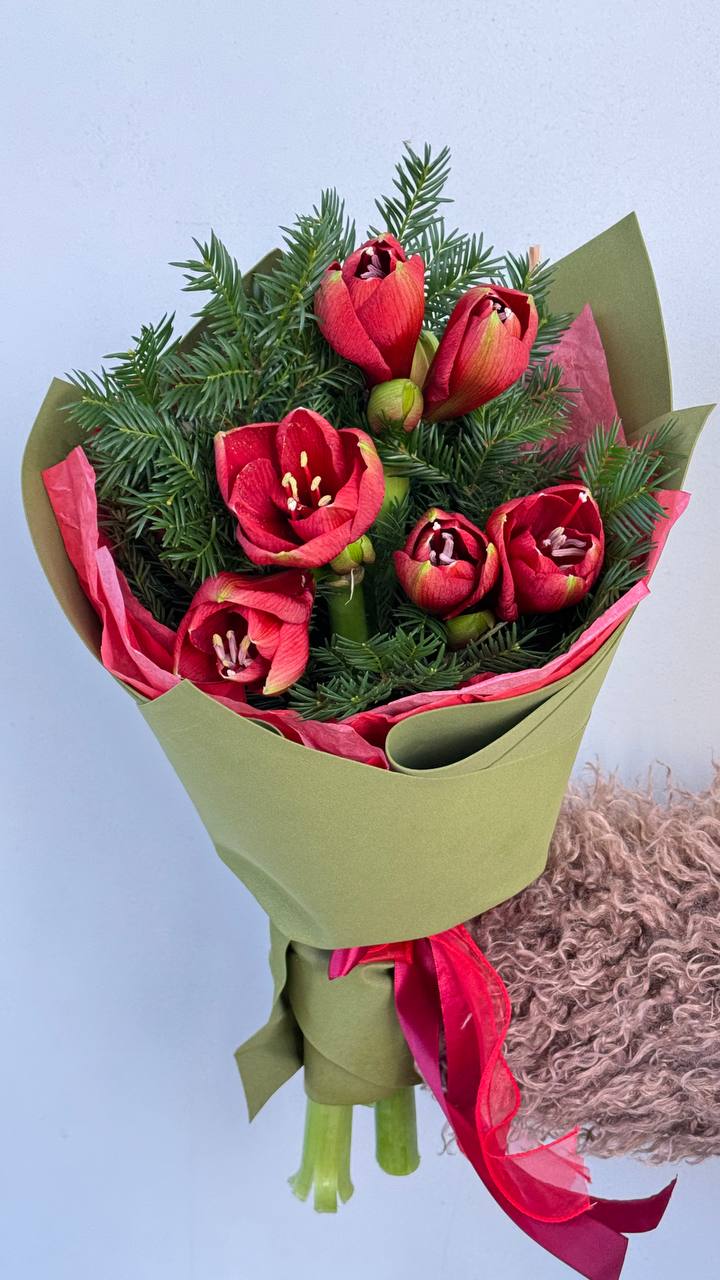 Создайте атмосферу праздничного тепла и уюта с роскошным зимним букетом из амариллисов! Эти величественные цветы, символизирующие красоту, гордость и жизненную силу, станут ярким акцентом в вашем интерьере или оригинальным подарком для близких.